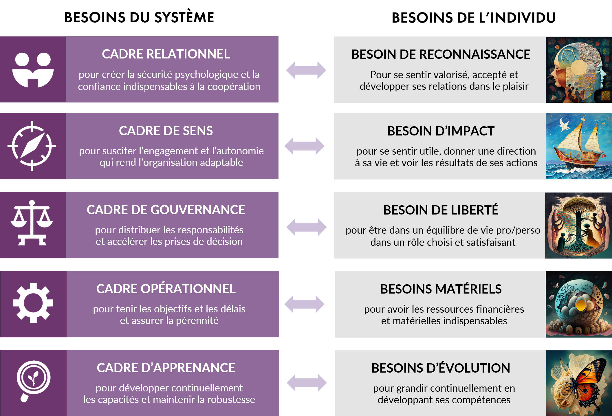 Notre approche repose sur un principe fondamental : la confrontation saine entre besoins personnels et besoins du système. Cette grille de lecture basée sur les 5 cadres systémiques révèle simplement les principaux dysfonctionnements d'une organisation.