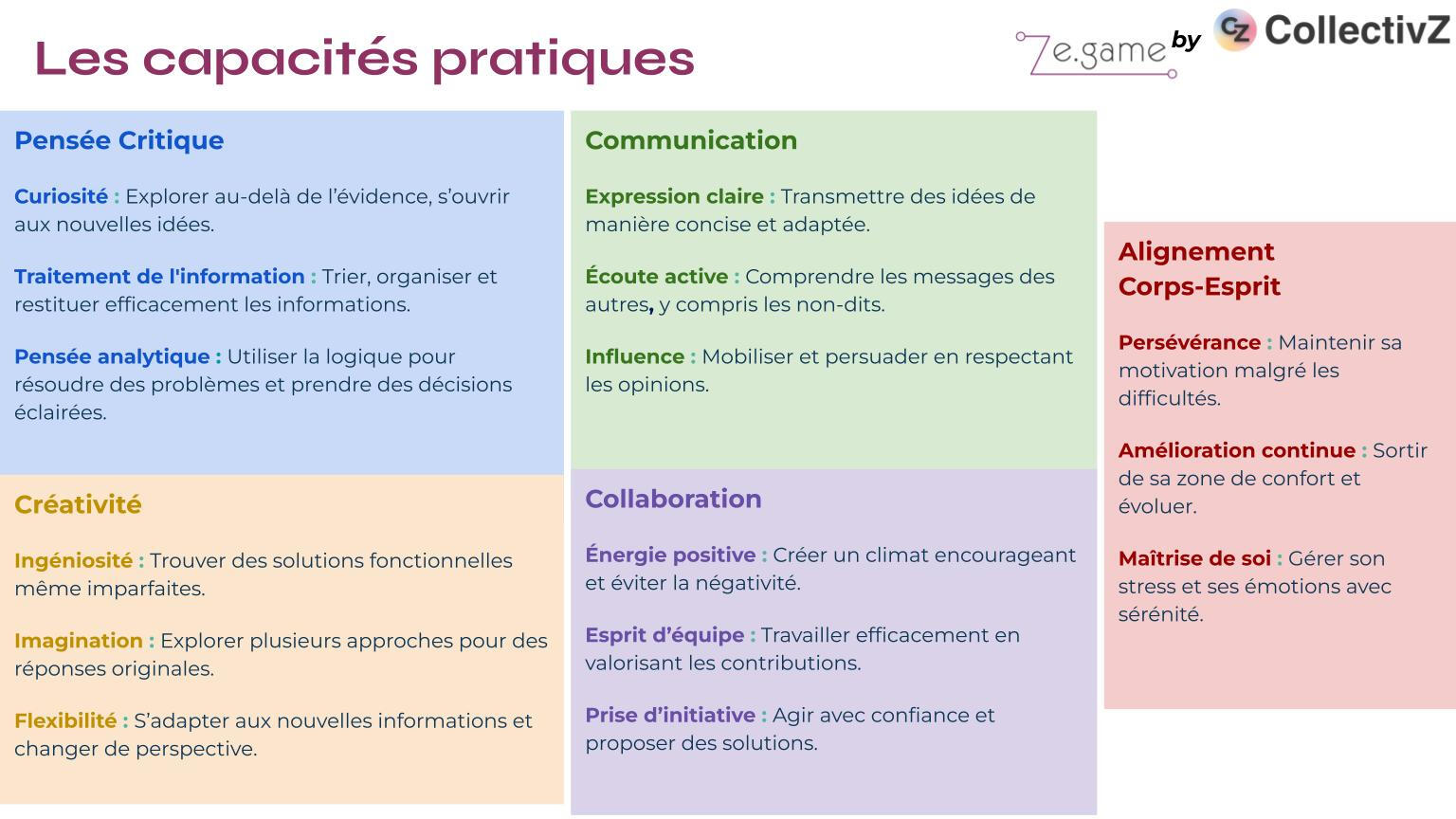 Avec l’application ze.game, les apprenants réalisent des challenges pédagogiques pour développer graduellement 15 capacités qui concrétisent les 5 compétences du XXIème siècle définies par l'OCDE :